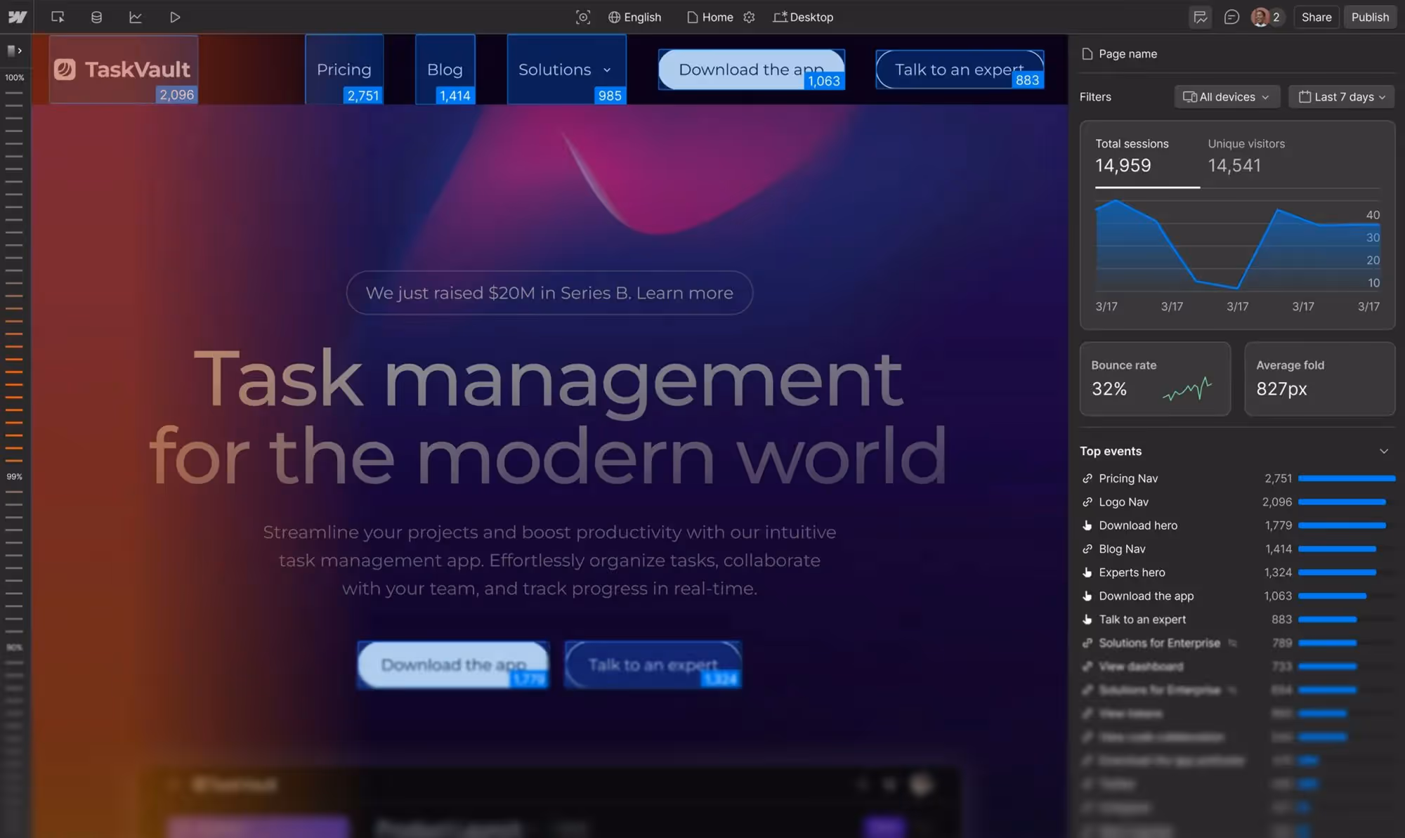 You get all the important data in one click from your Webflow dashboard. No hassle and nicely organized. But even though it's so organized, we still recommend using tools like Google Analytics, Clarity, and Hotjar as extra depth. Analyze is a super strong extra layer for spotting optimizations faster, precisely because it's in Webflow and it responds directly with your Website.